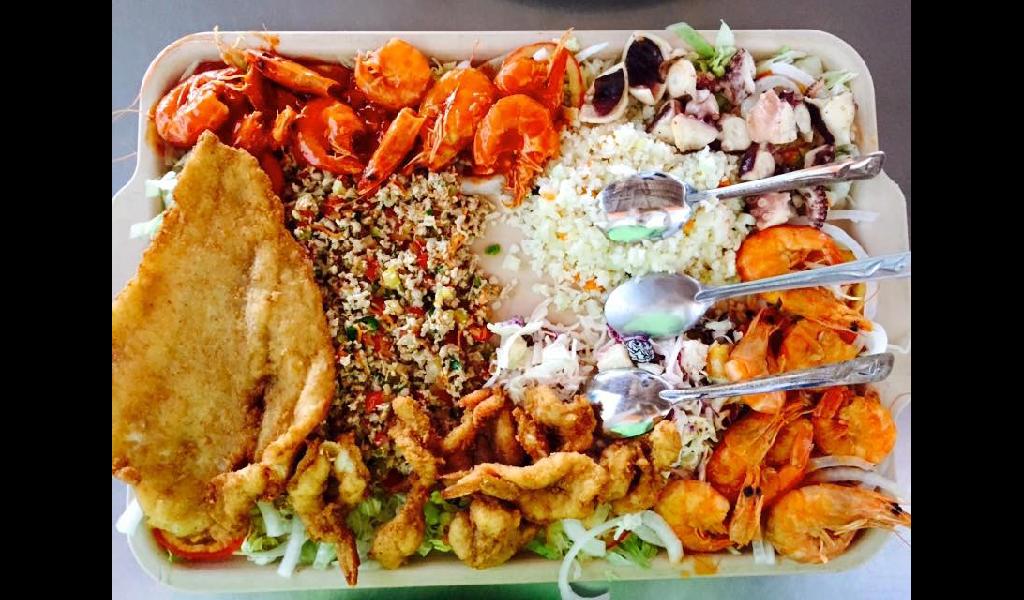 Platillo Mixto: Camarones a la diabla, camarones empanizados, camarones al mojo de ajo, filete empanizado, pulpo a la mantequilla.